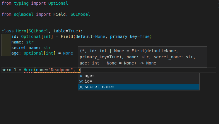 , etc. Your editor will be able to help you with everything because SQLModel is based on standard Python type annotations.